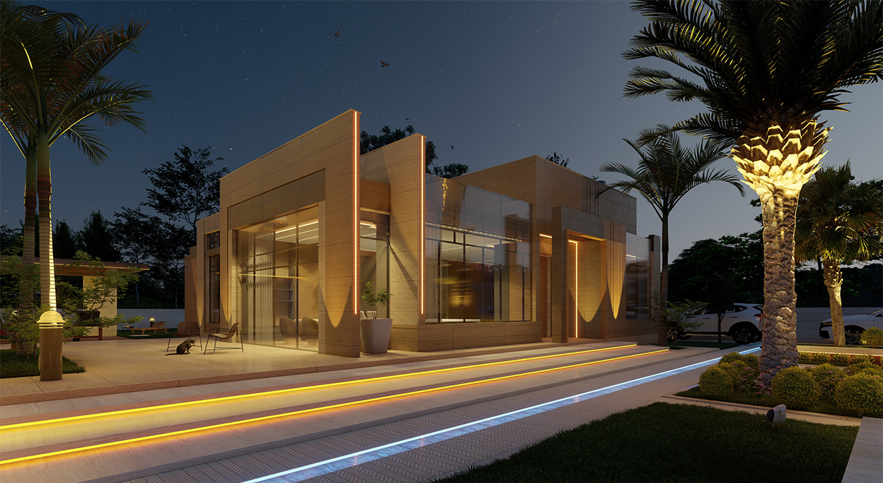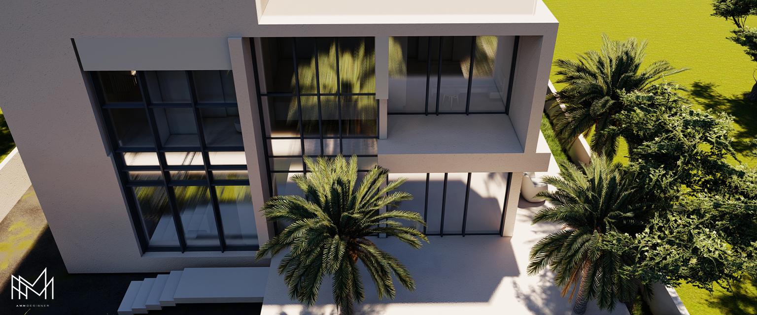 This modern villa is a masterpiece of architecture, reflecting simplicity in shapes, materials, and glass elements, harmoniously integrated with a soft and elegant landscape.